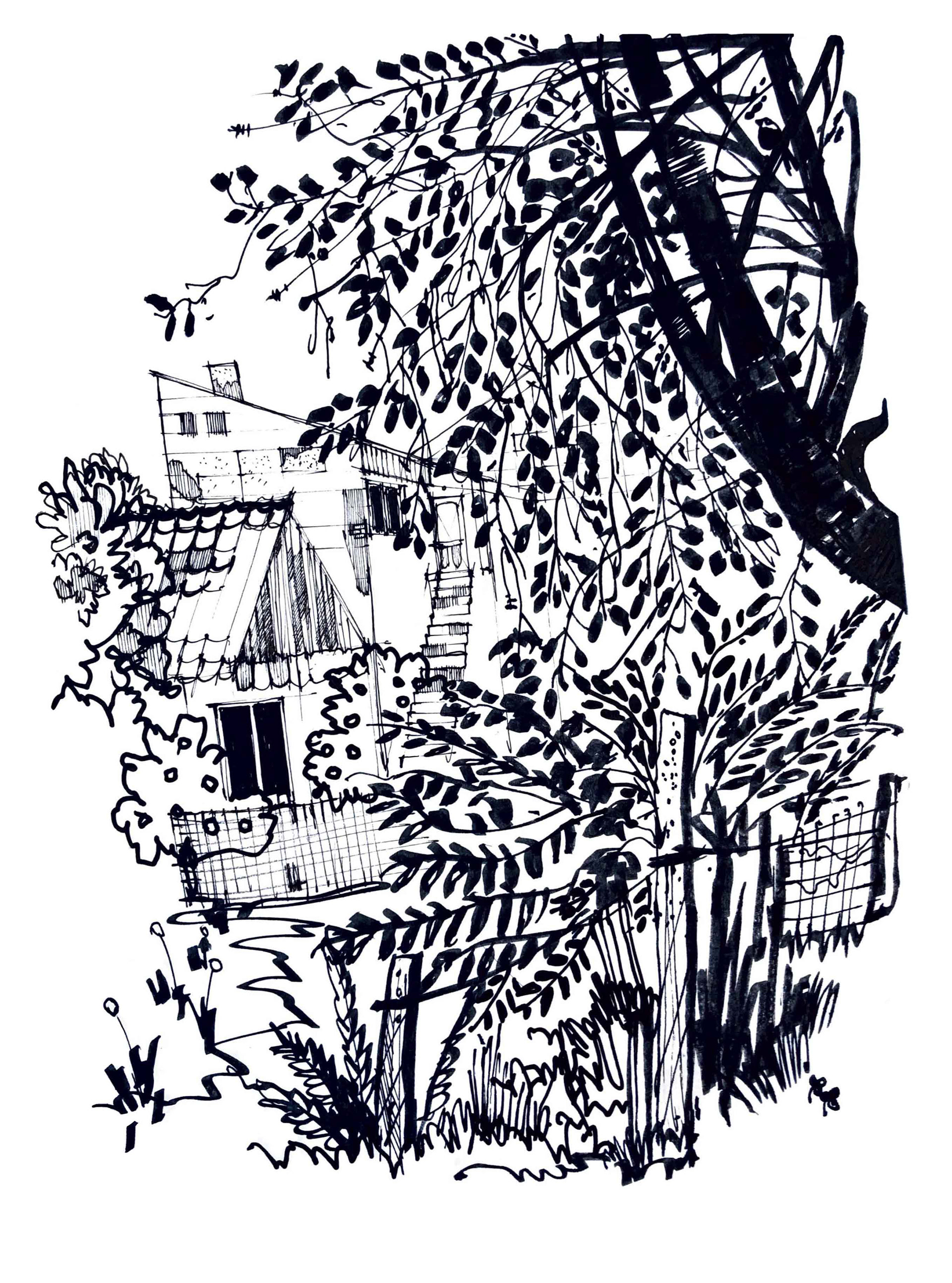 A series looking at the hidden back gardens of Eastern Europe. Ink, fine liner and brush on Moleskine 9 gsm paper.